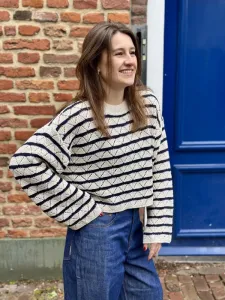 3301 Trui in het groen van The Korner. Een trui met wijde boxy fit en lange wijde mouwen. Het is gemaakt van een open breisel met patroon. Draag casual op een jeans zoals de Yoko Baggy. Twijfel je over de maat? App ons gerust. Monique draagt maat S/M.
