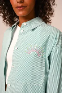 Ali Pelicana blouse van Sacrecoeur. Deze blouse heeft lange mouwen en een creme kleurige basis met een vrolijk geborduurde print van een pelikaan vogel. Langs de knoopsluiting een geel borduursel en rondom is de blouse versiert met crèmekleurig borduursel. De blouse heeft een kraagje. Het model valt los rond het lichaam, de mouwen vallen niet volledig lang. Afhankelijk van jouw lengte. Twijfel je over de maat? App ons gerust of kom langs in onze winkel.