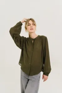 De Gladis Indigo blouse van Sacrecoeur is een effen blouse met lange mouwen, gemaakt van een lichtblauw viscose-wolmix. De losse, vloeiende snit wordt geaccentueerd door een smalle mandarijnkraag en plooien aan de voor-, achter- en manchetten. De licht gepofte mouwen geven het silhouet een lichte, elegante touch, terwijl de geknoopte manchetten een delicate afwerking geven. App ons als je twijfelt over jouw maat of kom langs onze winkel in Utrecht.