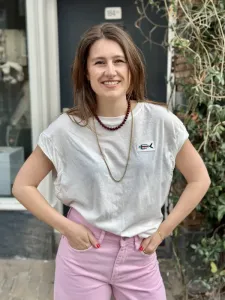 Hydralis Pull in geel wit gestreept van FRNCH. Deze polo trui heeft een contrasterende blauwe V hals en kraag. De trui is gemaakt van zachte stof met een beetje wol. De pasvorm is wijd en valt los rond het lichaam. Draag deze top op een jeans voor een casual outfit. Twijfel je over de maat? App ons gerust of kom langs in onze winkel. Monique draagt maat XS.