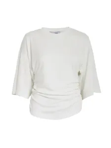 Juniana GOTS T-Shirt in het wit van Minus. Een prachtig shirt met getailleerde pasvorm en plooi details om de taille te accentueren. Het shirt heeft een ronde hals en wijde halflange mouwen voor een stijlvolle fit. Het is gemaakt van zacht duurzaam katoen. Een item dat je zowel chique als casual kan combineren, naar jouw stijl. Twijfel je over de maat? App ons gerust of kom langs in onze winkel. Voor een aangesloten pasvorm adviseren we een maat kleiner te nemen.