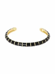 Vergulde bangle met zwarte emaille patroon van Ellen Beekmans. Verguld op longlasting stainless steel. De breedte van deze bangle is 5 mm. De binnenmaten van deze bangle zijn 6 x 5 cm. Deze bangle is er in 3 uitvoeringen in deze collectie.